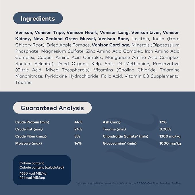 - HIGH PROTEIN, NUTRIENT DENSE: Featuring 96% free-range Venison, Organs, Bone, and New Zealand Green Mussels, this grain-free cat food delivers nutrition with a mouth-watering taste for all cats. Gentle air dried processing retains the goodness of the raw ingredients. This food supports indoor cat food needs and is perfect for all life stages, from kitten food to senior cats.
