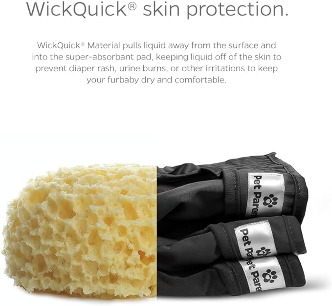 - HIGHLY ABSORBENT DOGGIE DIAPERS: Because we know your Great Dane 'goes' more than your Chihuahua, the diaper pad that is sewn into our dog diapers female increases with the size, because bigger dogs = more liquids. WickQuick material wicks liquid from the surface and into the dog period diapers, keeping your furbaby dry and reducing urine burn or irritation. Our diapers also have a waterproof outer layer to prevent leaks and damage to rugs, carpets, upholstered chairs and sofas.