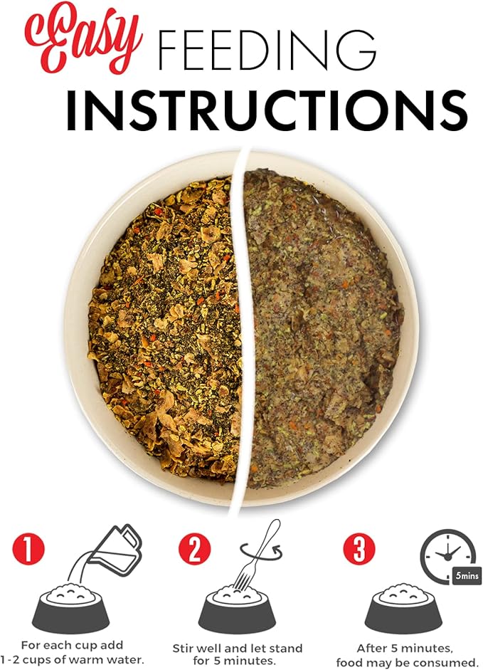 - JUST ADD WATER - For each cup of dog food add 1-2 cups of warm water. Stir well and let stand for 3-5 minutes