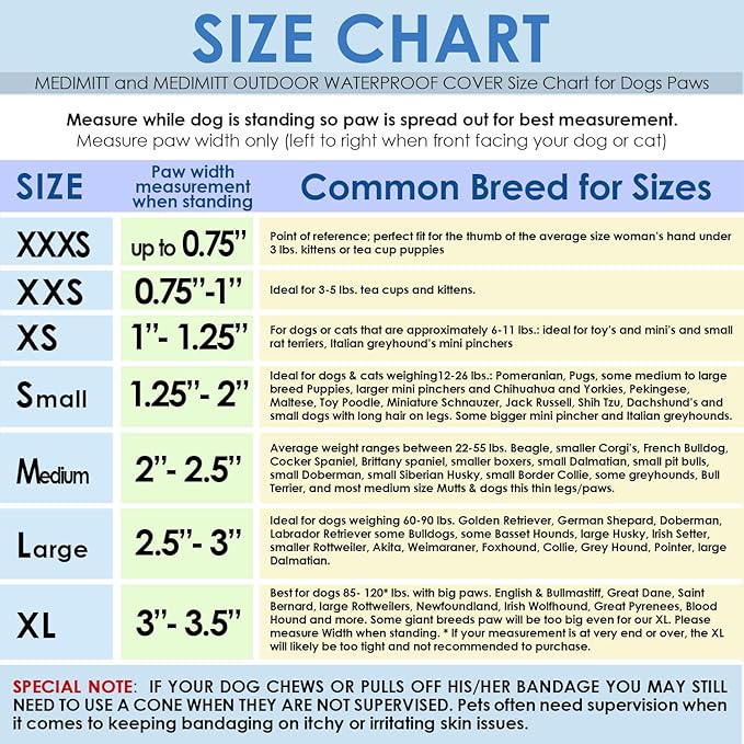 - Size SMALL – paw width measurement when standing: between 1.25” - 2”. Ideal for dogs & cats weighing12-26 lbs.: Pomeranian, Pugs, some medium to large breed Puppies, larger mini pinchers and Chihuahua and Yorkies, Pekingese, Maltese, Toy Poodle, Miniature Schnauzer, Jack Russell, Shih Tzu, Dachshund’s and some Italian Greyhound, Rat Terrier. IF YOUR DOG CHEWS OR PULLS OFF HIS/HER BANDAGE YOU MAY STILL NEED TO USE A CONE WHEN THEY ARE NOT SUPERVISED.
