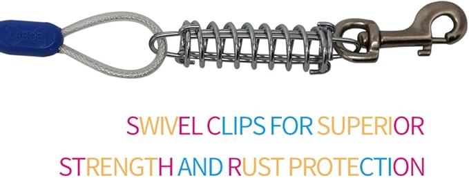 - Snaps, which is durable and anti-rust, on both ends can be easily attached to a post or stake and buffer spring at the end for a protection of dog's neck.