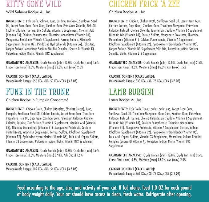 - Kitchen Cuties Variety Pack, (10oz Can, Pack of 12) Featuring a variety of wild salmon, cage free chicken and lamb in a delicious Au Jus. An all natural blend of premium proteins that cat’s can't resist!