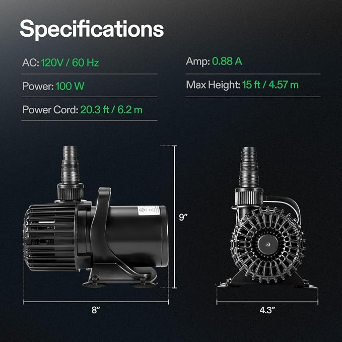 - Energy Saving with Low Noise: Ultra-quiet operation design(30-40db); Less power(100W) consumption with high output(1600GPH/6000LPH) which compared to other pumps; Fits for 264 Gallon Pond