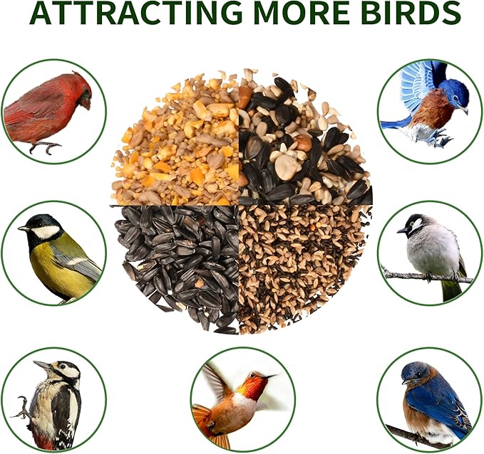- Four Sides Feeding: This spacious bird feeder accommodates 2 suet cakes and 5.18 pounds of seed, creating a 360° all-access dining station that attracts multiple bird species to your backyard oasis.