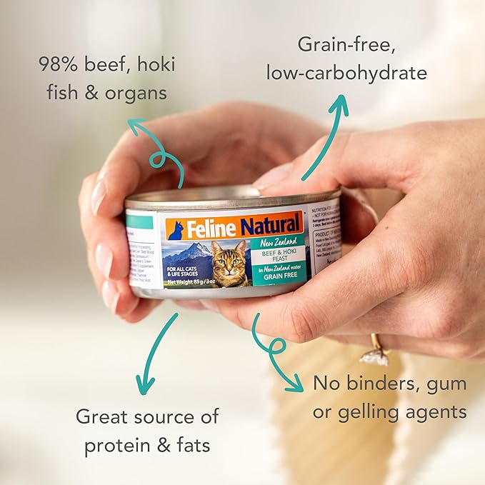 Feline Natural New Zealand Canned Catfood Wet Food, High-Meat, Low-Carb, & Grain Free Cat Food Wet, Beef & Hoki Feast, 3 oz, Pack of 24