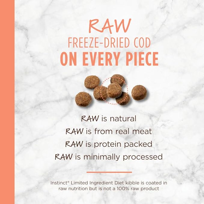 - THE FIRST RAW COATED KIBBLE: Instinct Limited Ingredient dry cat food is cat food where every piece of kibble is coated in freeze dried raw for nutrition and taste. Perfect for sensitive stomachs, LID Salmon contains delicious flavor that cats crave.
