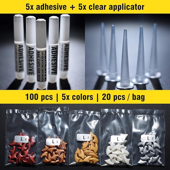 - [ PACKING ] 5x 20 pieces Cat Claw Caps / set + 5x Adhesive + 5x Applicator