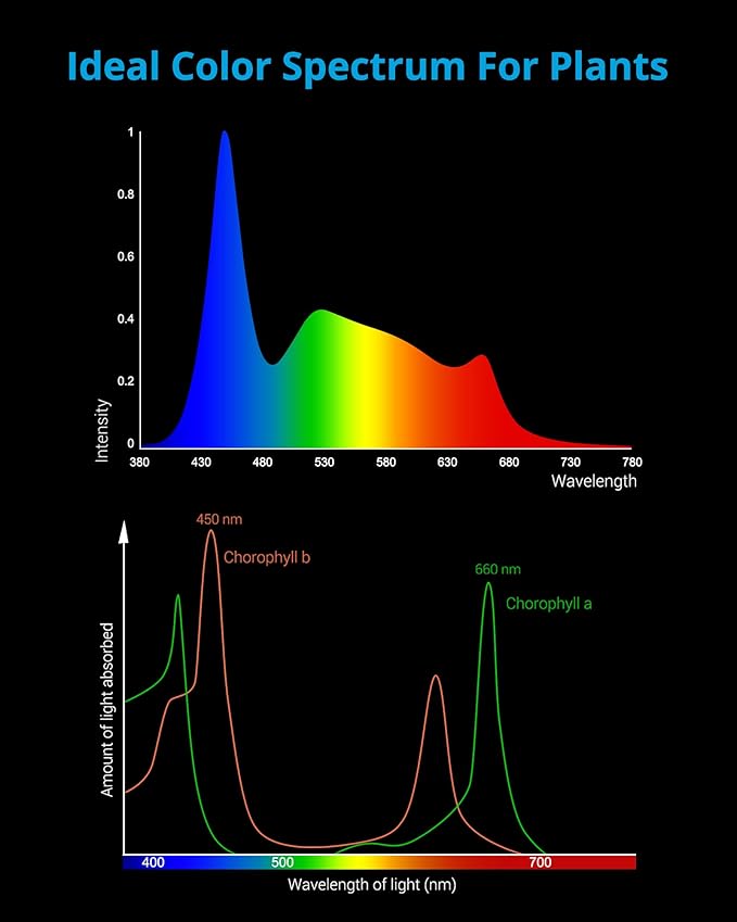- The full-spectrum light combines 6500K white, 450nm blue, TRUE 660nm deep red and green LEDs, producing a fine-tuned color spectrum. Adjustable spectrum on 2 lighting modes achieves more control flexibility. (Spectrum adjustable only when using timer, not for manual on)