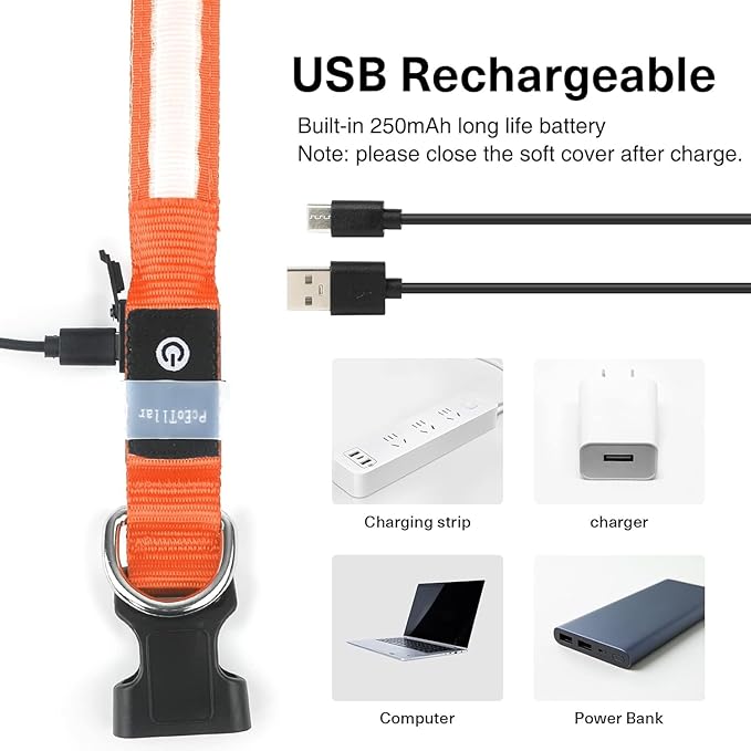 - Rechargeable Led Dog Collar: PcEoTllar dog collar is waterproof. No worries about the collar when your dog is swimming or playing under the water! Please close the Soft Charging Cover after charging and please stay away from sea-water. Rechargeable with any other daily USB device is more convenient, you will not paying for batteries anymore! Full power can last 10 hours.