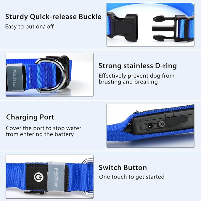 - Durable & Adjustable Lighted Dog Collar: Super strong 100% polyester webbing material with high-tensile stitching for maximum strength & dog security. Easy to put on with a quick-release buckle. And the length of our led dog collar can be adjusted to fit any size. You can even use the led dog collar for animals such as sheep, deer or ponies.