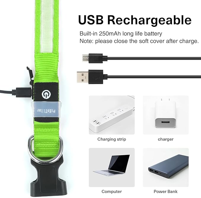 • Rechargeable Led Dog Collar: PcEoTllar dog collar is waterproof. No worries about the collar when your dog is swimming or playing under the water! Please close the Soft Charging Cover after charging and please stay away from sea-water. Rechargeable with any other daily USB device is more convenient, you will not paying for batteries anymore! Full power can last 10 hours.