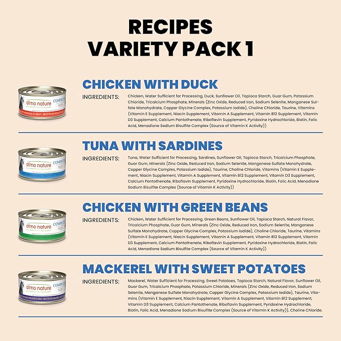 - CATS LOVE THE TASTE! Picky eaters will enjoy this high-protein recipe, made with meat/fish as first ingredient with Chicken & Duck, Tuna & Sardines, Chicken & Green Beans, and Mackerel & Sweet Potatoes. Grain-free delicious for happy cats and empty bowls