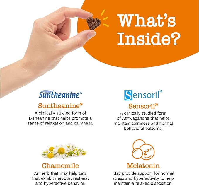 - Advanced Ingredients – The Thiamine, L-Tryptophan, L-Theanine, Chamomile in these chews may help with signs of normal stress such as hiding, excessive meowing, or changes in appetite.