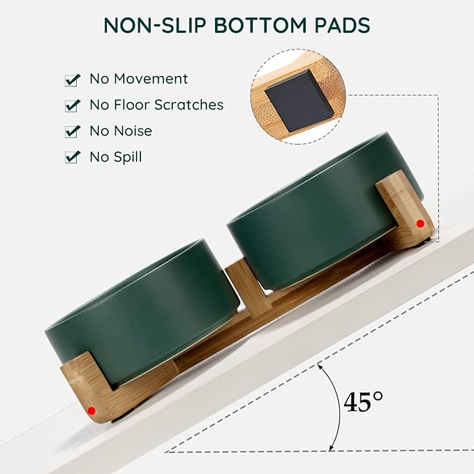 • Double Bowl Design:One dog bowl for food and one for water, Each ceramic cat bowl has a Unique wooden stand, raising the dishes closer to your pet for more comfortable eating