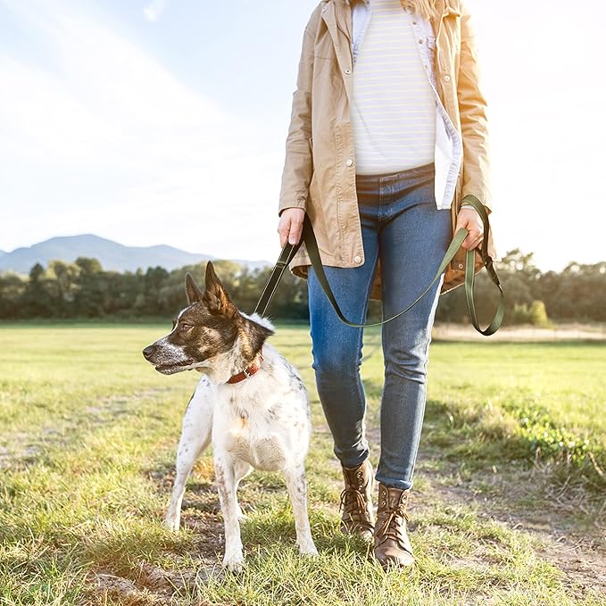 - 【SOFT PADDED DUAL HANDLES】5FT ideal length, 1 inch width leash for medium dogs, Comfortable Padded handles protect your hand without rope burn. Extra Handle for traffic control. Green dog leash is perfect for outdoor activities, running, walking or training.