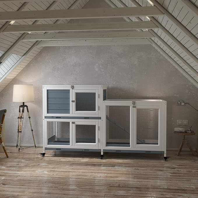 GDLF Two Floors 58" Wooden Indoor Bunny Hutch Rabbit Cage on Wheels Guinea Pig PET House for Small to Medium Animals Waterproof No Leak Tray