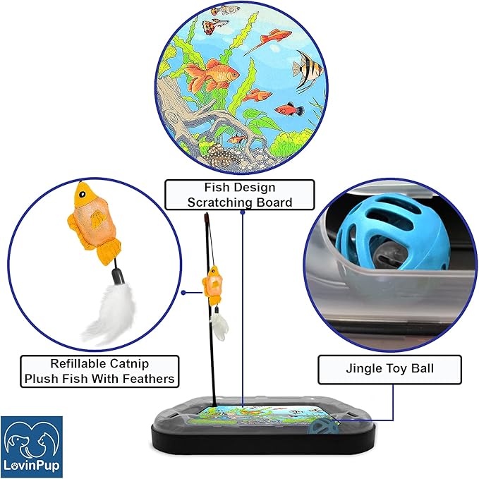 - FUN CAT SCRATCHING TOY - The LovinPup Cat SCRATCHER Toy is more than just the usual Cat Scratcher Board. It has 5 unique features that all appeal to your cat and will have your cat begging to play all day. It includes the CAT SCRATCHING BOARD, EXCITING FISH AQUARIUM DESIGN, an INTERACTIVE BALL WITH A BELL, a PLUSH FLOPPY FISH TOY with a FEATHER, and CATNIP INSIDE the FISH TOY!