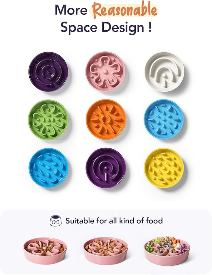 - Slow Down Eating, Bring Dog A Healthy Diet: Fast-eating dogs experience bloat, regurgitation, and obesity easily. Our slow feeder dog bowl design with the ridges and maze pattern helps your dog to eat slower than 10 times. Your dog could change his overeating behavior through a challenge and fun mealtime