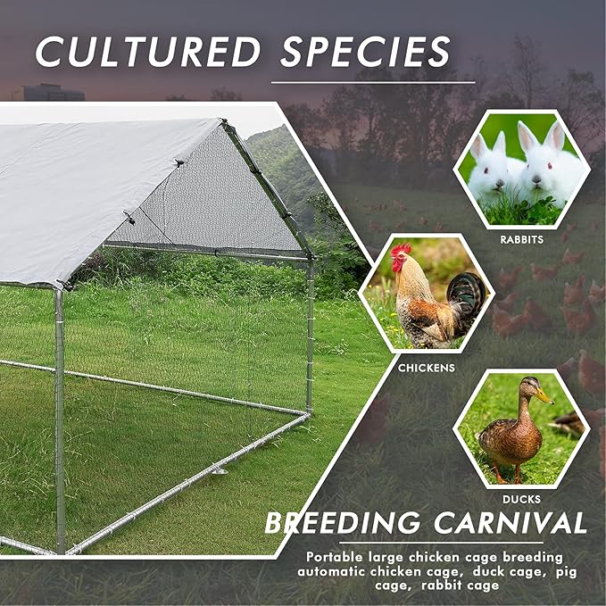 - Large Poultry cage: The coop size is 13.2’ L×9.84’ W× 6.4’ H, Enough for someone to walk in. The large coop is big enough to hold more than ten chickens
