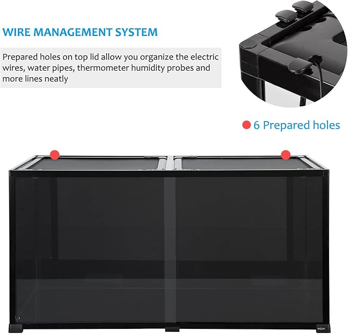 - 【Tempered Glass & Aluminum Frame】High quality tempered glass bottom base and aluminum alloy frame ensure this reptile terrarium is sturdy and safe. Raised bottom 0.5In in order to fit a substrate heater underneath, and waterproof bottom can be used as desert terrarium or rainforest tank.