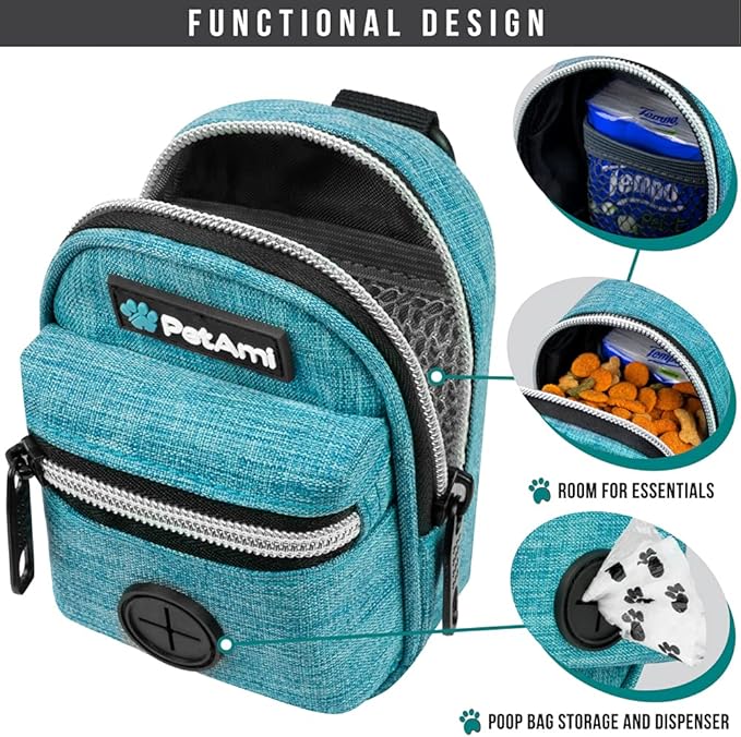 - TEAL BLUE WALKING BAG: PetAmi poop bag holder dispenser includes one roll of dog poop bags, measures 4.7 x 1.8 x 3 inches, and is made of durable oxford polyester. Cute mini backpack doggy trash bag carrier is refillable and is compatible with most dog poop bag rolls. This pet travel bag is a great gift for dog mom, dad, parents, owners and trainers. Comes in multiple colors to mix and match your dog leash.