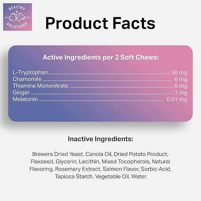 - ๐ธ VETERINARIAN FORMULATED -- with Melatonin, Chamomile, Passion Flower, Thiamine, L-Tryptophan, and Ginger to help soothe sensitive stomaches.