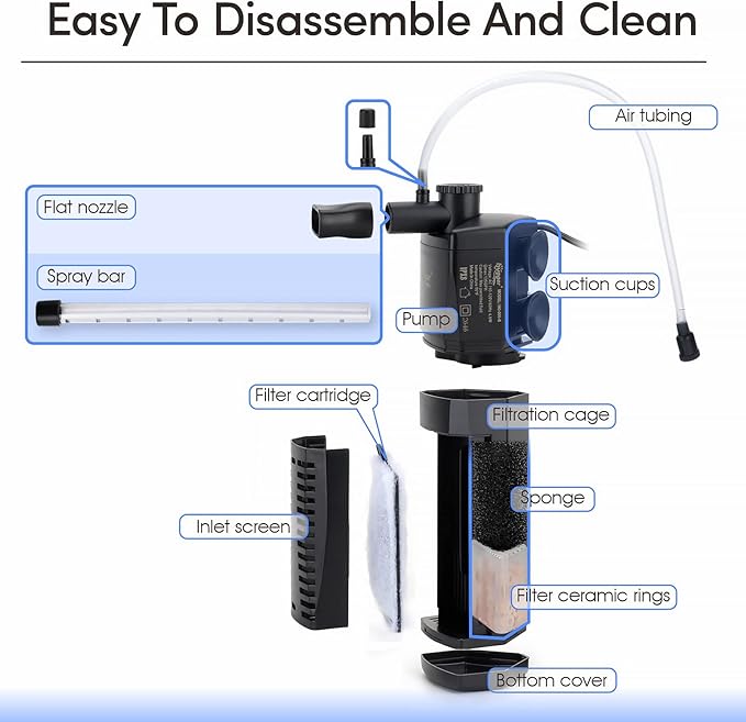 - Simple Disassembly and Easy Cleaning: This filter is effortless to set up, small, it can be used on 3-10 gallons small fish tanks. Take apart to rinse clean and has a reusable media, making regular maintenance a snap.