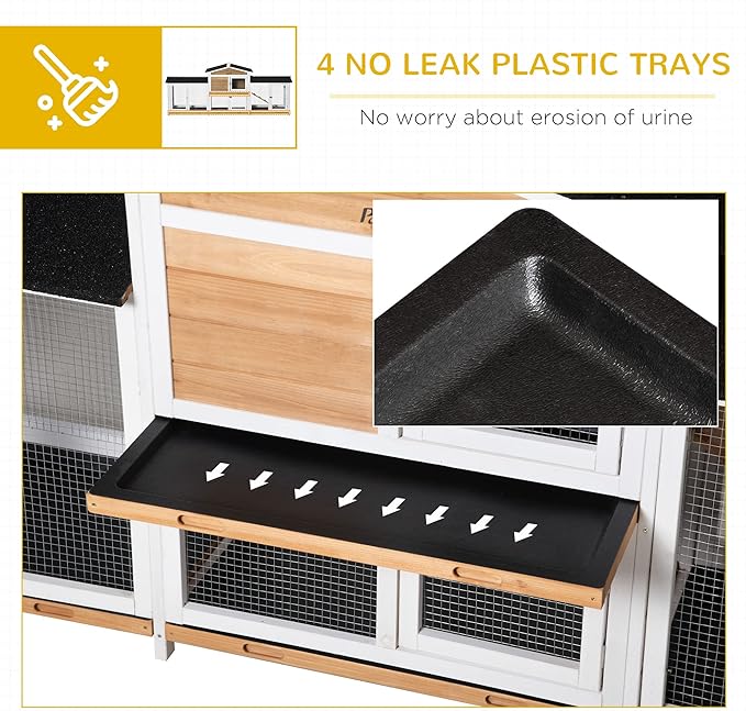 - Easy to Clean: The main house and each run box of this rabbit hutch outdoor have built-in slide-out trays underneath, making cleaning this hutch super-easy.