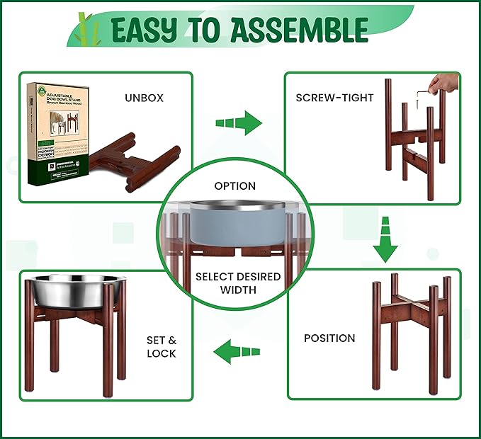 - Easy Assembly in Minutes โ This water bowl stand sets up in just a minute. Stack the two parts and tighten with the screw. Place the dog water bowl of your choice on top of the platform and adjust the legs close to the bowl. When the stand perfectly fits the bowl, lock the rails with the bolts and nuts. Its now ready to add dog food or water to the feeder.