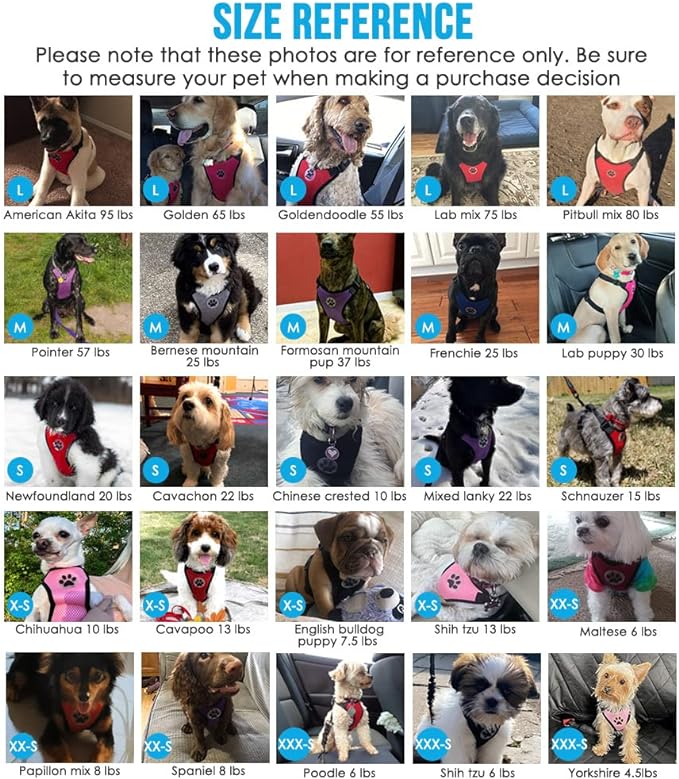 - Easy On & Quick Fit --- No need to “step in” to put on the vest harness, the two quick release buckles on the chest part help to easy on and off. And the four adjusting loops on chest and belly part ensures snug but comfortable fit, suitable for all small, medium and large size dogs, or even kitten cats and medium cats.