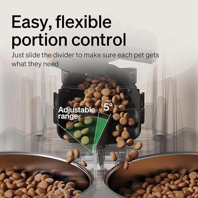 - Feed Two Cats: PETLIBRO automatic cat feeder for two cats comes with an adjustable meal splitter. The unique movable meal splitter ensures food is distributed evenly, and the size of the portions can be adjusted to suit the needs of different cats and dogs. So you can be sure your pets won’t have any fights. And you can check the feeding records to ensure your cat or dog has been fed on a set schedule by APP and also can be controlled from multiple family members’smartphones.