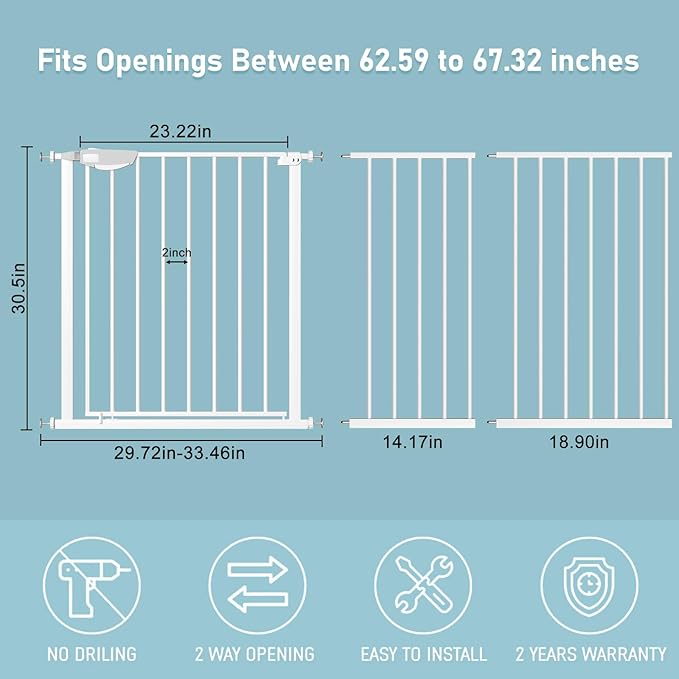 - 【Multi Use】The width of the triple lock extra wide pressure mounted baby gate can be adjusted from 25.59 inches to 81.49 inches so that it is available for stairs, doorways, and other diverse occasions to stop babies or pets to climb over. Tips: before installation, there will be a gap between the wide gate latch and the frame which is NOT a defect and it is NOT bent. This gap will disappear once installed.