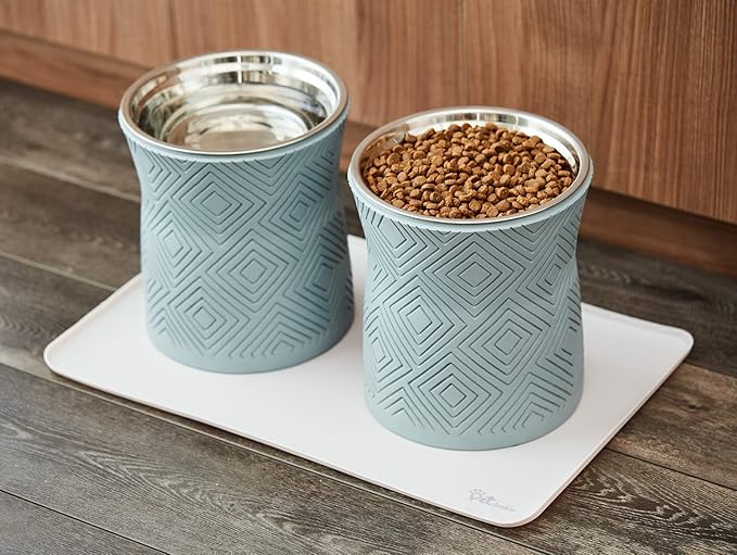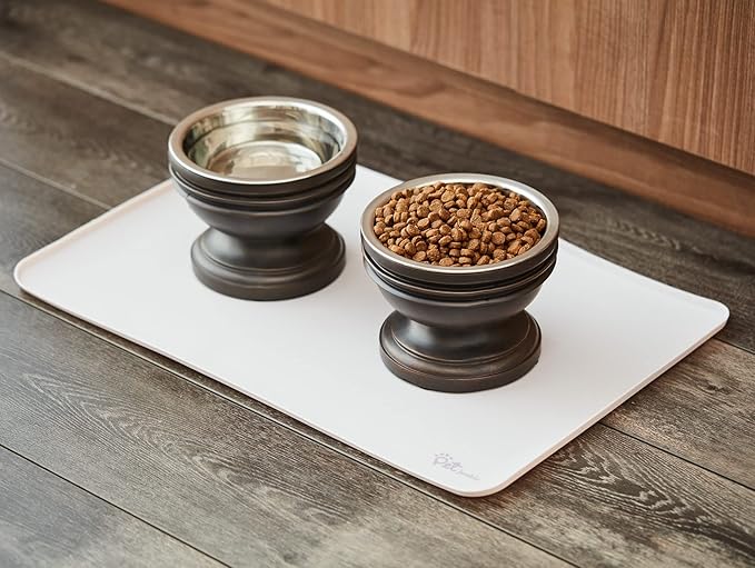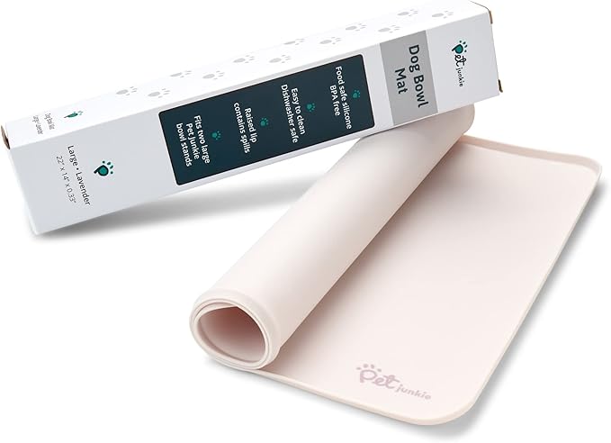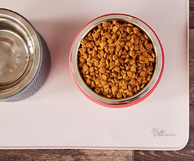 - LARGE AND SMALL PETS: 22" x 14" x 0.33" - This dog food placemat fits two Pet Junkie bowl stands or comparably sized pet dishes. Perfect size for a food mat for dogs or a cat feeding mat.