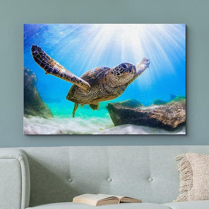 wall26 Canvas Print Wall Art Sunlight Ray Tropical Turtle Swimming Ocean Nature Animals Photography Realism Rustic Scenic Landscape Wilderness Colorful for Living Room, Bedroom, Office - 32"x48"