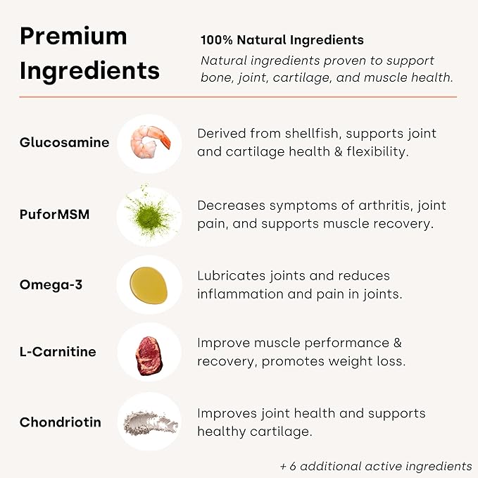 - Active Ingredients : Glucosamine, Chondroiting, Omega 3, MSM, L-Carnitine