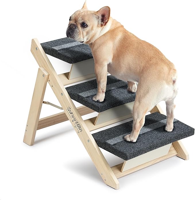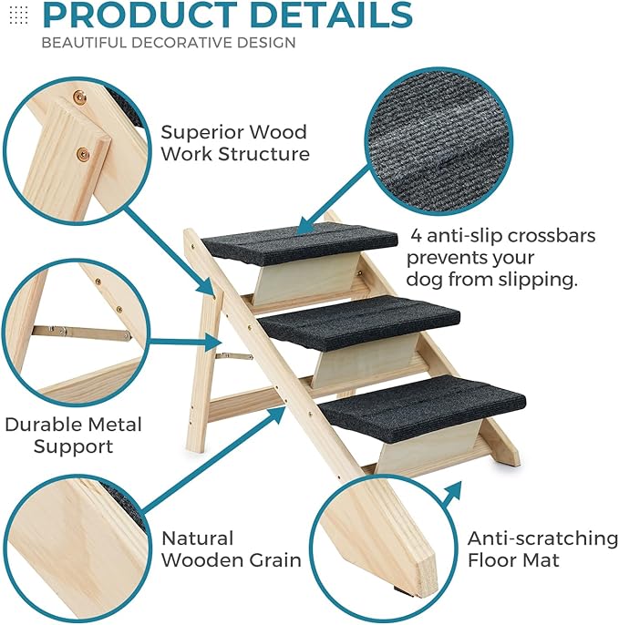 Wood Pet Stairs/Pet Steps for All Dogs and Cats - 2-in-1 Foldable Carpeted 3 Tiers Dog Stairs & Ramp Perfect for Beds and Cars - Portable Dog/Cat Ladder Up to 120 Pounds