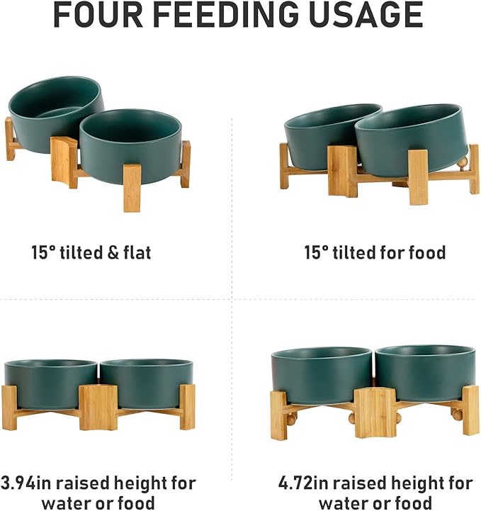 SPUNKYJUNKY 15° Slanted Ceramic Dog and Cat Bowl with Wooden Stand, Tilted Bulldog Food and Water Bowl No Slip Non-Spill for Cats Medium Dogs Big Face Pets 28.7 OZ (3.6 Cups, Green × 2)