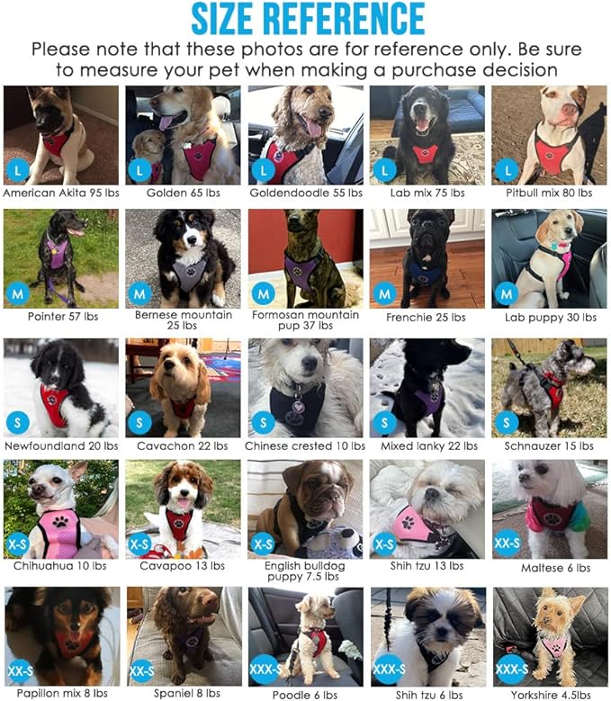- Easy On & Quick Fit --- No need to “step in” to put on the vest harness, the two quick release buckles on the chest part help to easy on and off. And the four adjusting loops on chest and belly part ensures snug but comfortable fit, suitable for all small, medium and large size dogs, or even kitten cats and medium cats.