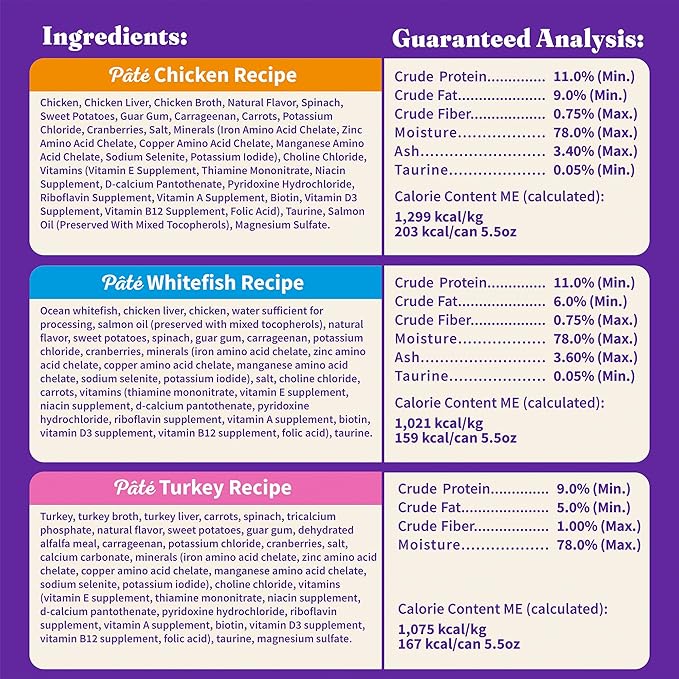 - SMOOTH AND TASTY – Only premium ingredients to see here. Our super tasty variety pack of pates have a smooth texture with tender bits of colorful vegetables plus the benefit of added hydration, with an aroma and taste that cats love. Even picky eaters can’t help but dig in.