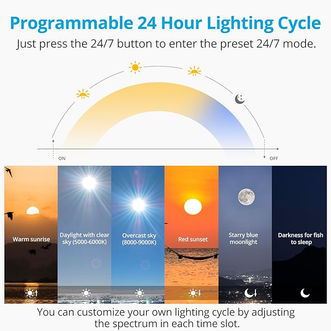 - EASY-TO-USE 24/7 MODE: The fish tank light can perfectly simulate the natural 24-hour cycle of sunlight. Just press a button, hands-free simulating fire red sunrise to blue starry night