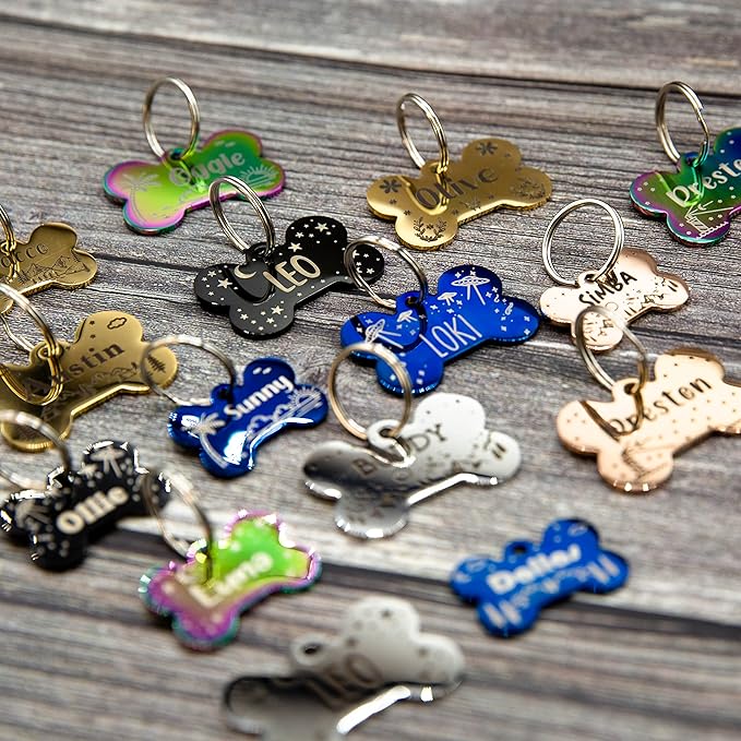 - Our engraved dog cat tags personalized solid stainless steel have color plating in Gold, Rose Gold, Blue, Black, Nebula are incredibly durable and long-lasting.