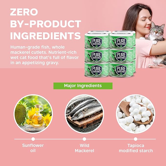 - HUMAN-GRADE FISH FOR CATS – Pure Cravings mackerel cat food is human-grade fish, whole mackerel cutlets. Nutrient-rich wet cat food that’s full of flavor in an appetizing gravy.