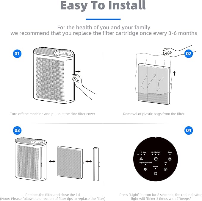 - Prevent Clogging: When hairs, dander, and other large particles meet the pre-filter layer, they will be blocked outside to prevent the air purifier from clogging.
