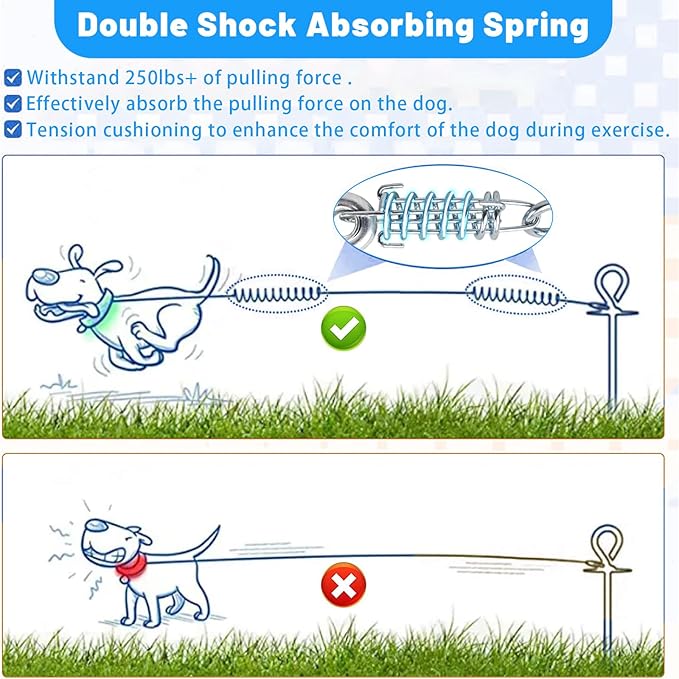 - DOUBLE BUFFER SPRINGS: Buffer springs are provided at both ends of the rope to maximize the protection of dogs. It can buffer the pulling force produced by the dog when running fast, reduce the damage to the dog's neck and body, and give the dog a more comfortable playing environment. provide a more comfortable playing environment for the dog.