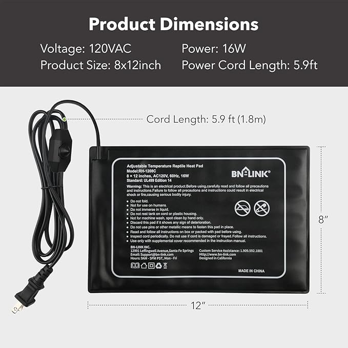 - MADE FOR REPTILES: Voltage: 120 volt, Power: 16 watt. The 8" x 12" model is perfect for a 10 -20 gallon terrarium and it can easily put out steady heat between 104℉ and 122℉. Each unit comes with BN-LINK’s strong 15-month warranty.