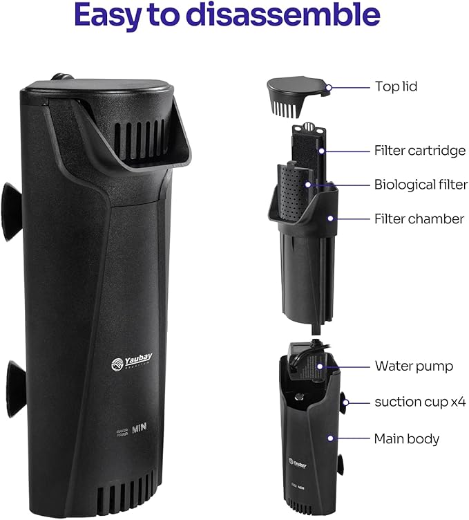 - 【Ultra Quiet Filtration】 This whisper internal filter sounds less than 35 dB. Top protective grate prevents animals from entering the fish tank filter.
