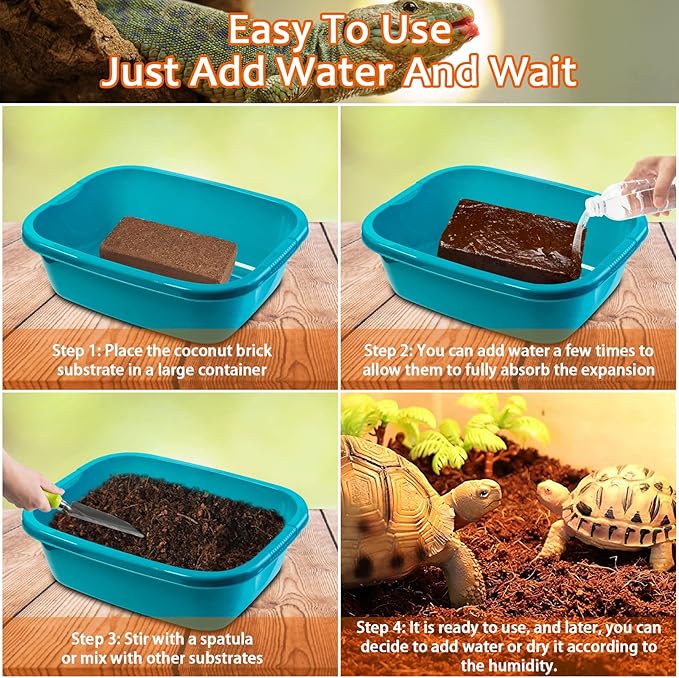 - Easy to Use and Store: These coco bricks are compressed and dense. Just soak the brick in water, coco coir will instantly and easily soak up water and expand into a clean, fluffy substrate. Our Coconut husk fiber is a great substrate for any reptile or amphibian that needs a substrate / bedding that can retain moisture