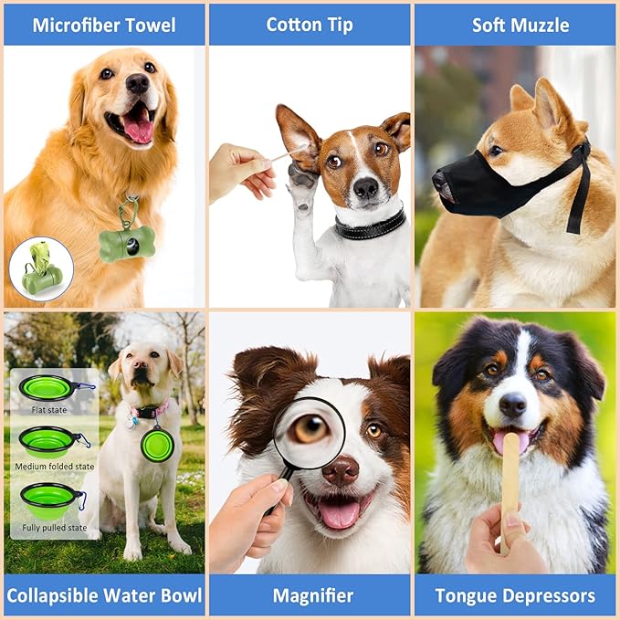 - A MUST-HAVE FIRST AID KIT FOR PETS --- Do you have an active pet such as dog or cat? Then you definitely need this pet first aid kit. It contains FIRST AID SUPPLIES including gloves, bandages, self adhesive vet tape, tweezers, scissors... and USUAL CARE SUPPLIES like pet pill feeder kit, microfiber towel and magnifier, etc