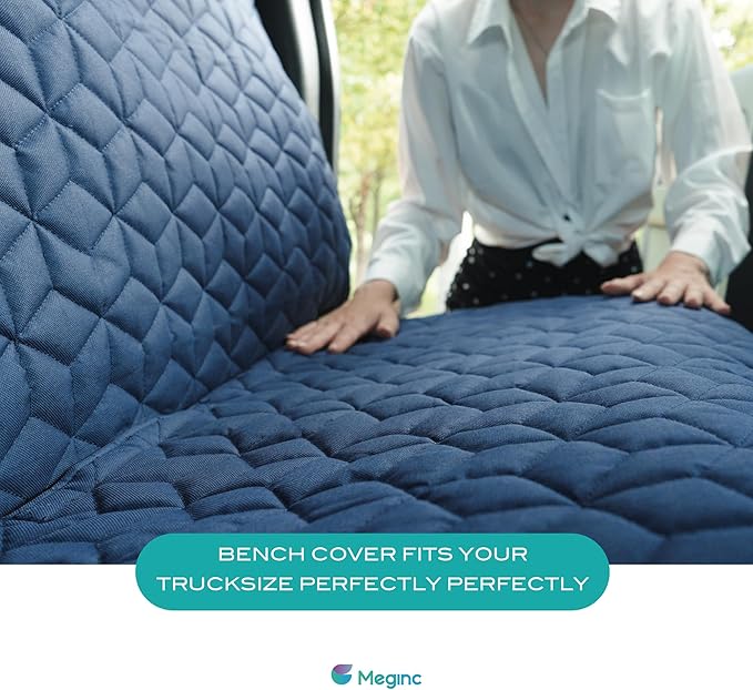- 🚗【STURDY MATERIAL】: HEAVYDUTY! HEAVYDUTY! HEAVYDUTY!Meginc bench seat covers is made of 600D Oxford cloth, 100g soft PP cotton, 210D polyester fabric, 100% waterproof TPU and PVC anti-slip mesh. A thick pet seat cover can mitigate the damage of your vehicle and protect carpet, upholstery from unpleasantries such as dog hair, urine, or vomit, moreover our protectors also providing a familiar, comfortable and safety space for your pets during the road travel.