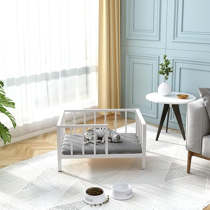 Dog Bed with Rails - Elevated Pet Metal Bed Frame with Solid Wood Board and Washable Soft Mat for Small Dog Indoor or Outdoor Use, 21.3" x 30 ", White